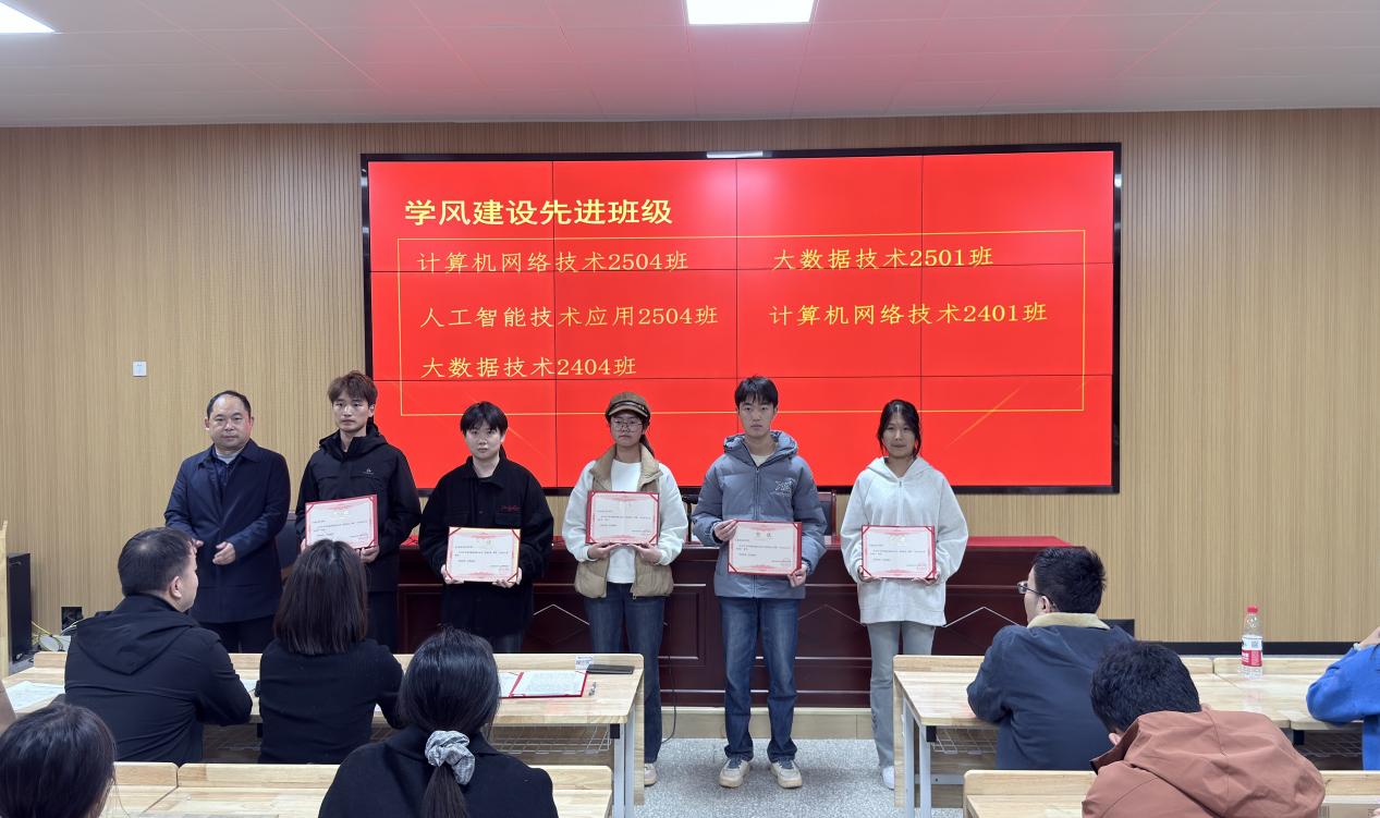 近日,人工智能学院学风建设表彰大会在天心校区北院综合教学楼阶一教室举行。学院党总支书记刘志勇、党总支副书记李平、副院长周要、团总支书记王玉、全体专兼职辅导员及学生代表齐聚一堂,共同见证荣誉时刻,共话学风建设新蓝图。