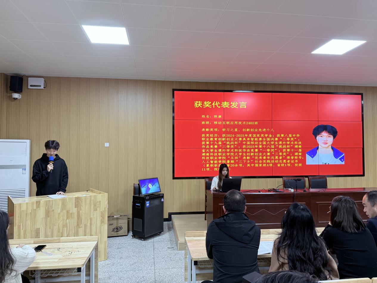 来自移动互联2402班的 “学习之星”兼 “创新创业先进个人”陈康作为获奖代表分享了自己的成长经历。他表示,个人的进步离不开学院的悉心培养和良好的学风氛围,未来将继续深耕专业知识,积极投身创新创业实践,不辜负学院的期望。