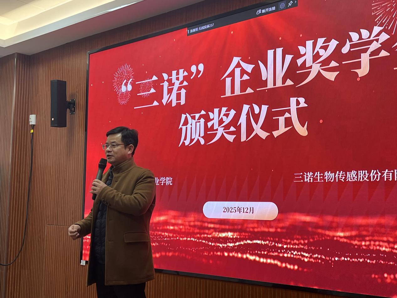 郑兴对三诺生物的长期支持表示衷心感谢,并介绍了“三诺”奖学金设立的背景与评选情况。该奖学金由企业专项赞助,旨在表彰品学兼优的药学学子,是校企协同育人的生动实践。